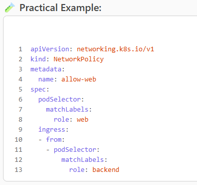 This allows only Pods with label role=backend to talk to role=web Pods.