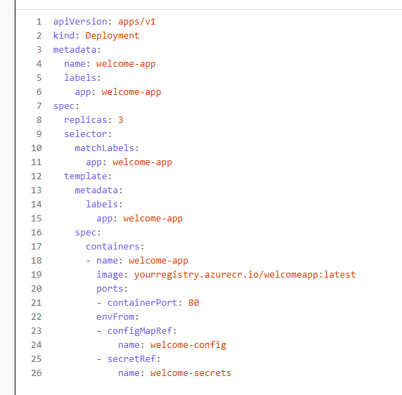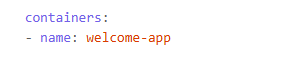 Why it’s used: Defines a container named welcome-app inside the pod.