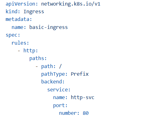 apiVersion: networking.k8s.io/v1(previouslyextensions/v1beta1, deprecated in 1.22+)kind: Ingressspec.rules: Define routing rules